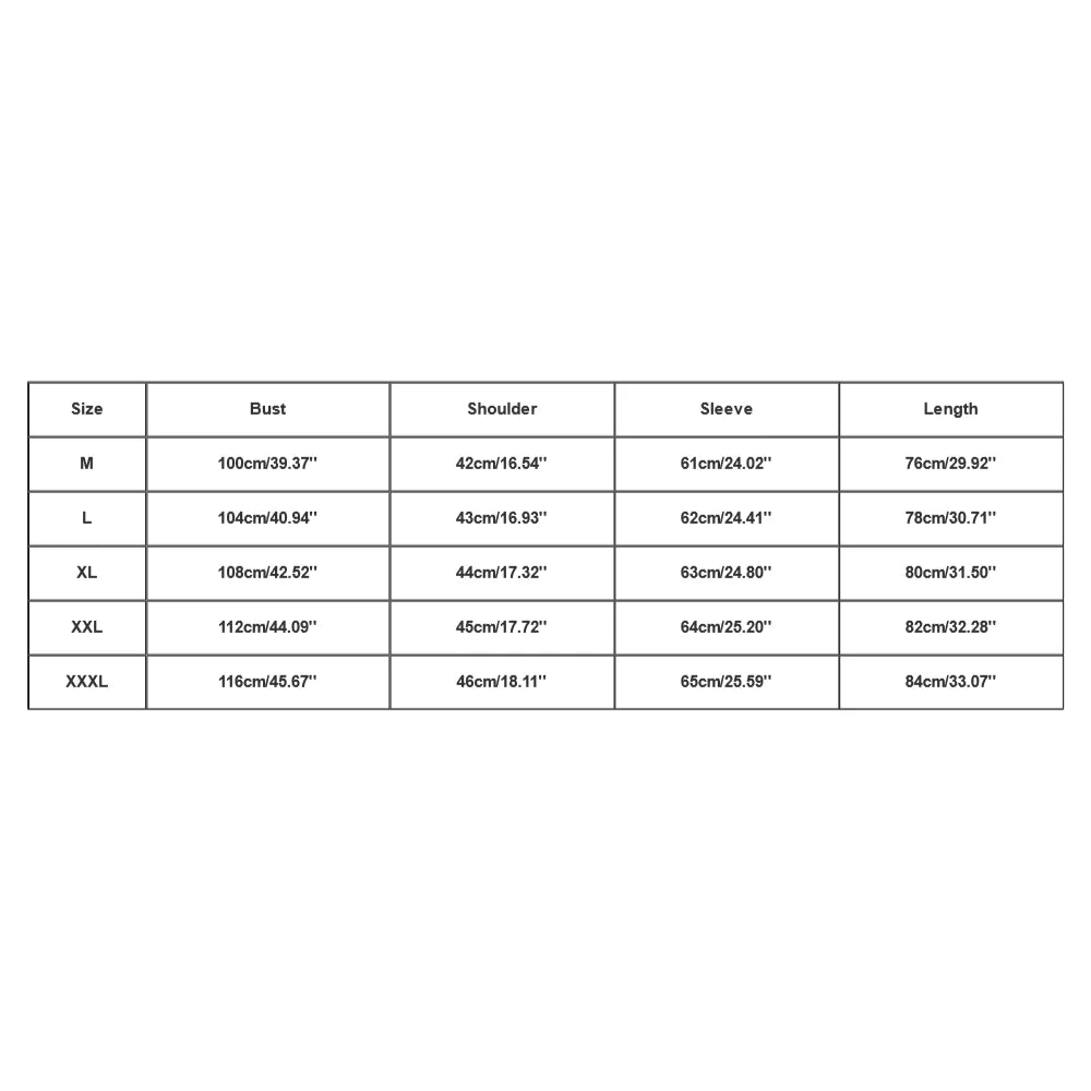 Size:XL | Bust:108cm/42.52'' | Shoulder:44cm/17.32'' | Sleeve:63cm/24.80'' | Length:80cm/31.50'' |